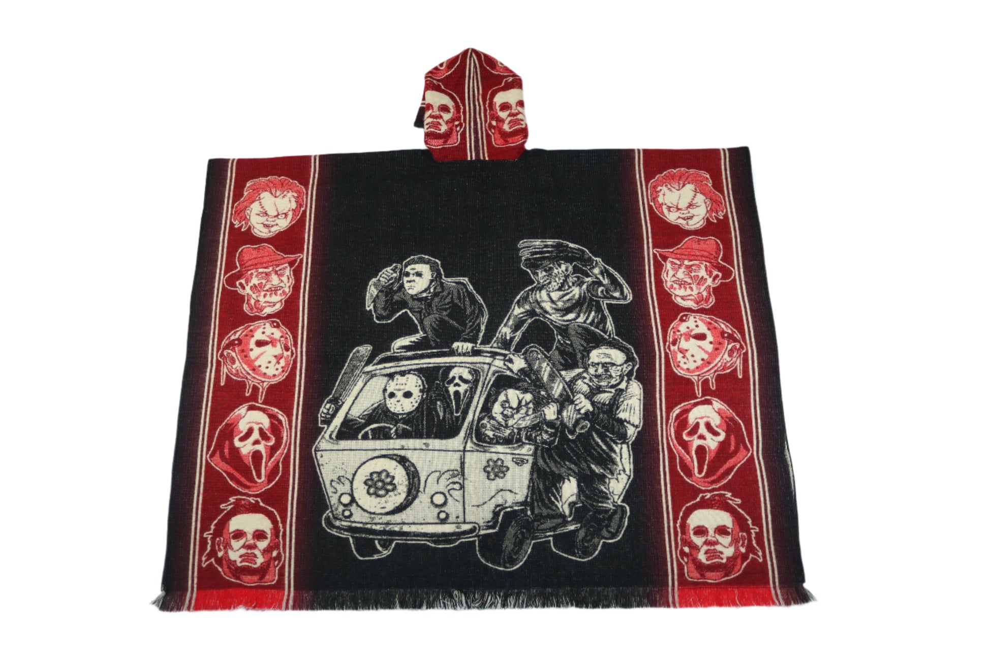The Killers' Club Poncho features iconic horror designs including Chucky, Jason, Michael Myers, Ghost Face, and Freddy Krueger. Show your love for classic horror with this poncho. Represent some of the most infamous characters in the genre!